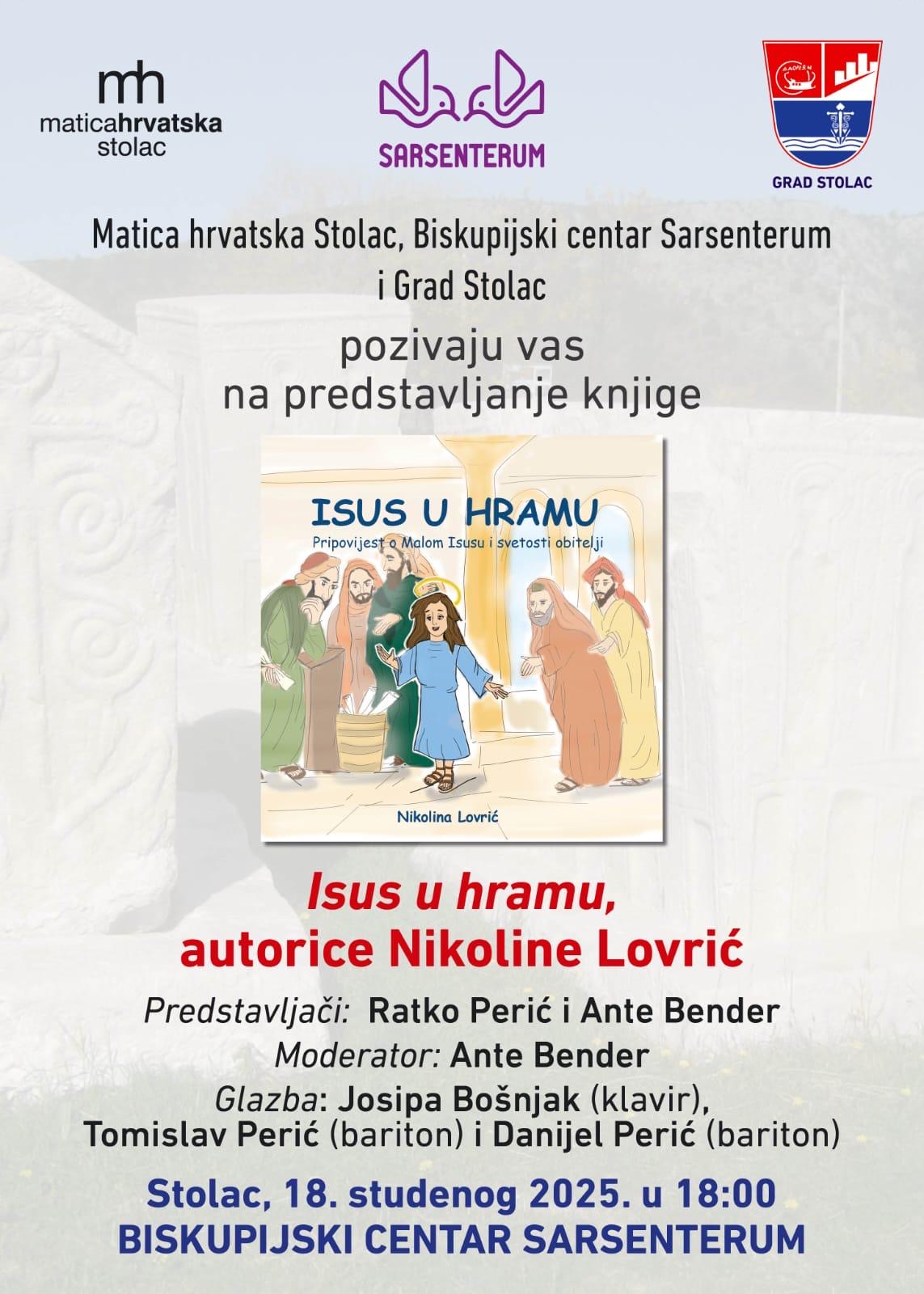 Matica hrvatska Stolac, Biskupijski centar Sarsenterum i Grad Stolac organiziraju predstavljanje knjige Isus u hramu, autorice Nikoline Lovrić. Riječ je o djelu koje na pristupačan način donosi pripovijest o malom Isusu i svetosti obitelji, namijenjeno prvenstveno najmlađim čitateljima, piše Stolac city.