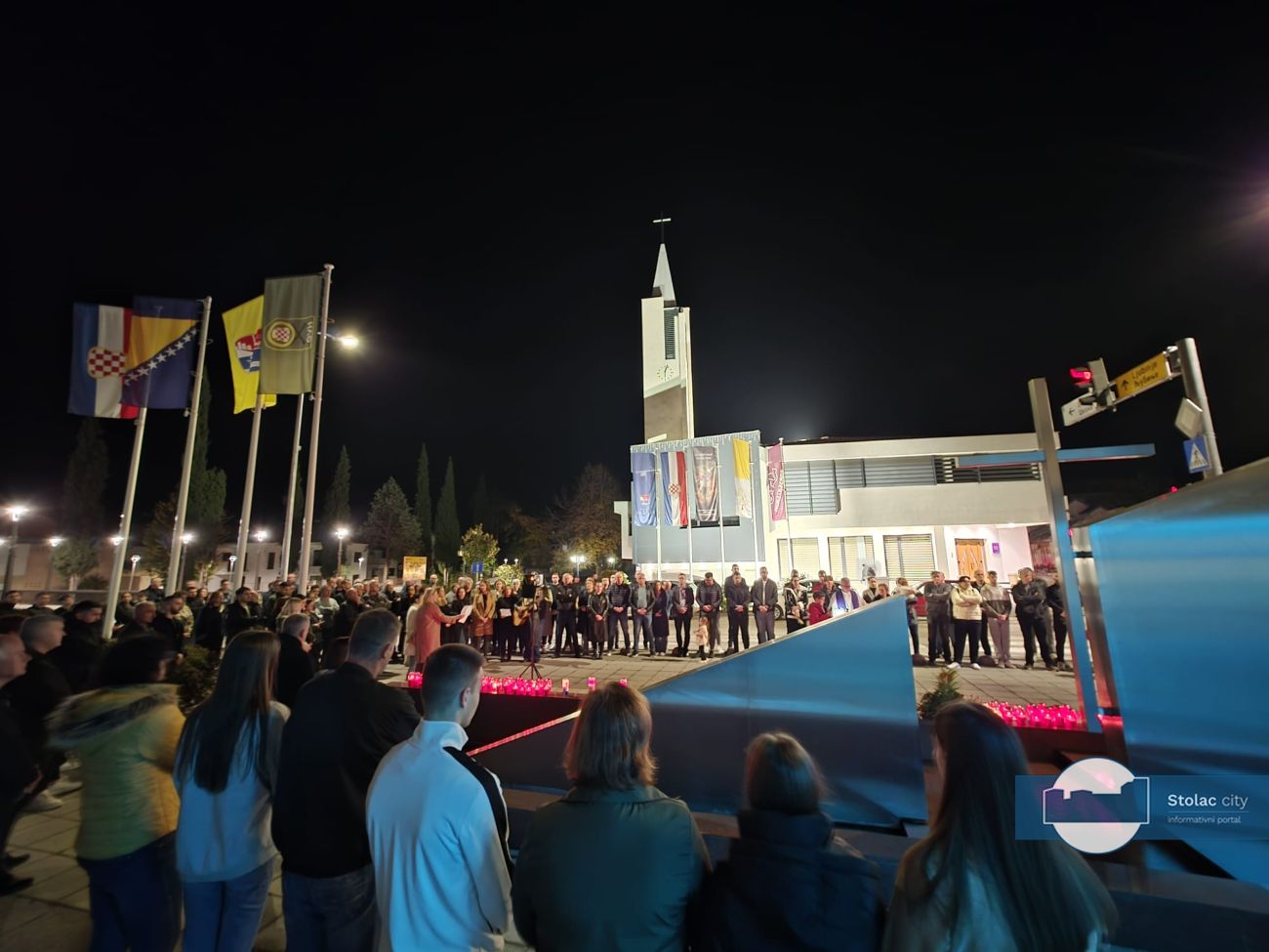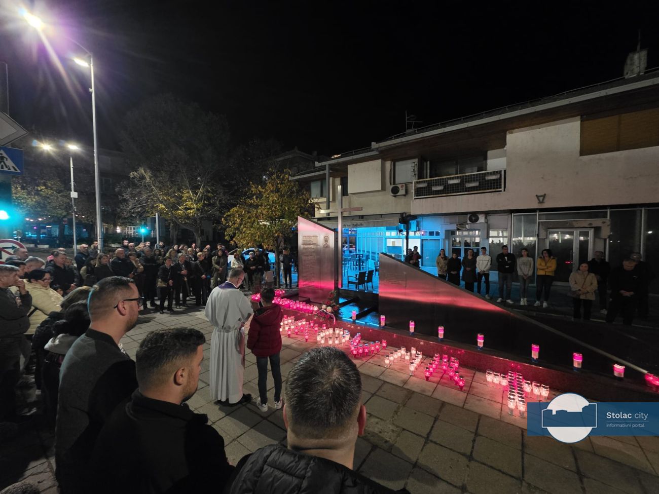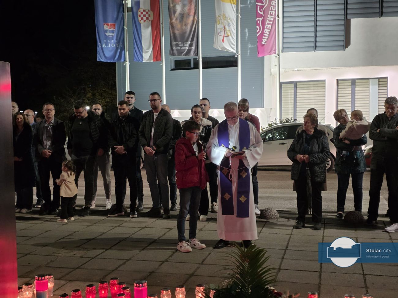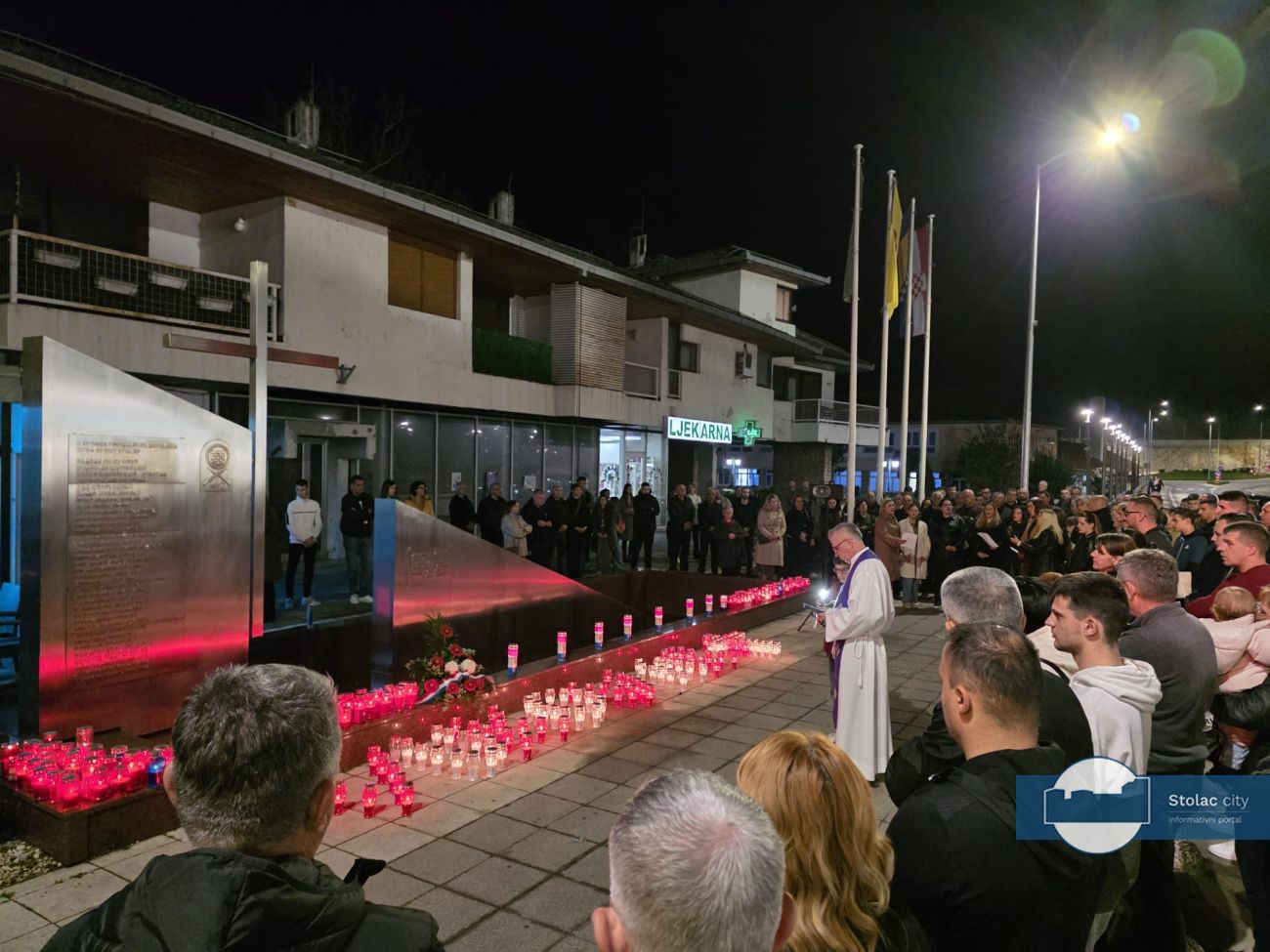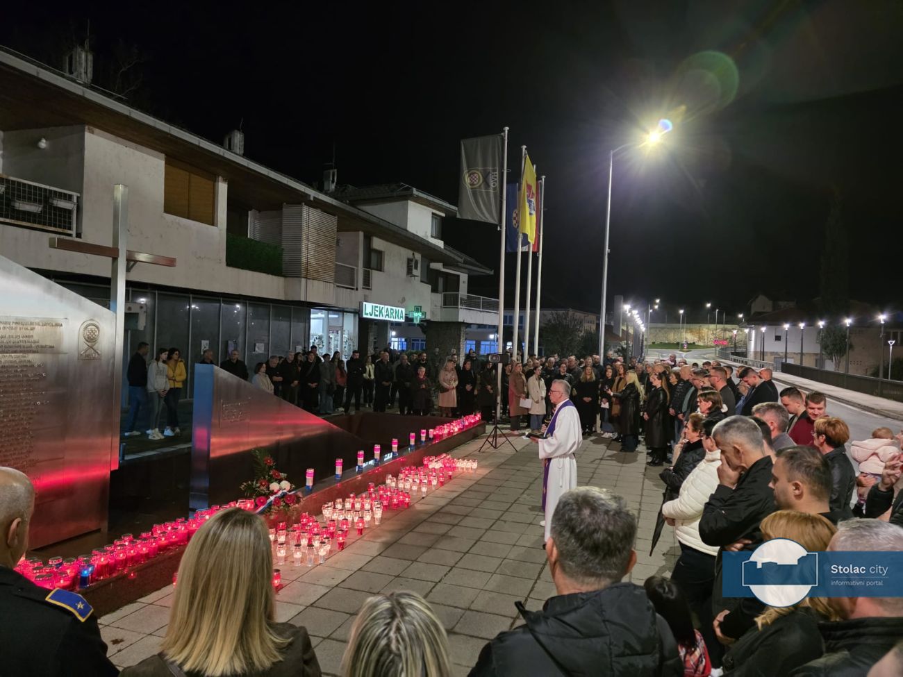 Tišina je ispunila centar grada dok su se svijeće nizale uz spomenik. Molitvu je predvodio i prigodnu riječ uputio don Gordan Božić, stolački župnik, koji je svojim riječima prizvao mir i zahvalnost prema žrtvi hrvatskih branitelja, posebno onih koji su stradali u Vukovaru i Škabrnji. Istaknuo je kako je obveza svih generacija njegovati uspomenu na hrabrost i žrtvu te u miru graditi budućnost koja će biti dostojna onih koji su dali najviše što se može dati, vlastiti život.