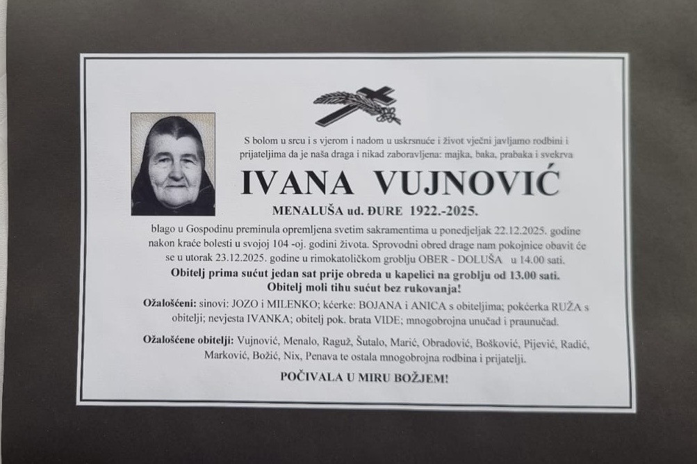 Sprovodni obred obavit će se u utorak 23.12.2025. godine u rimokatoličkom groblju OBER – DOLUŠA u 14.00 sati. Obitelj prima sućut jedan sat prije obreda u kapelici na groblju od 13.00 sati.